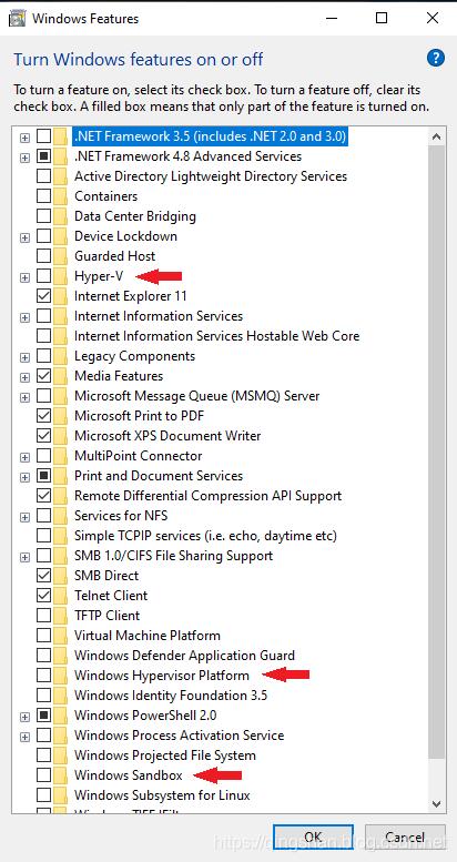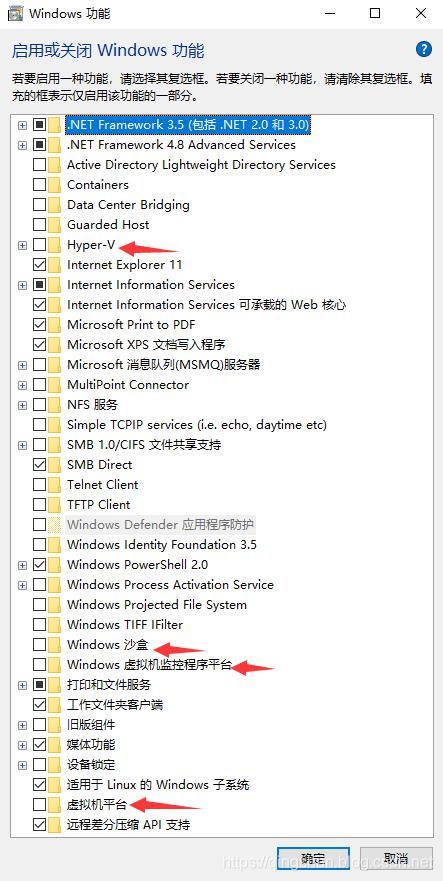 2.关闭Win10的Hyper-V和Windows Hypervisor Platform 和 Windows Sandbox。