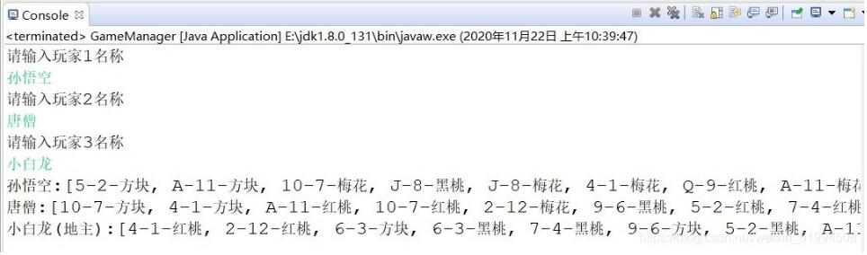 * 5、参考斗地主的游戏规则,完成一个发牌的功能(54张牌,考虑点数,花色;三名玩家,其中地主比其他玩家多3张牌)