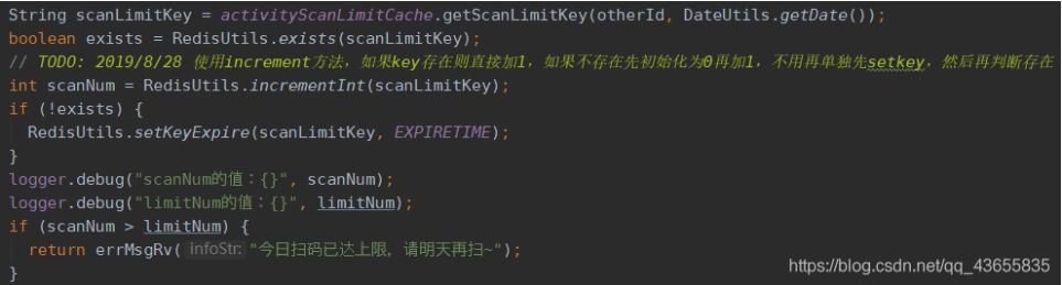 一直知道redis可以用来实现计数器功能,但是之前没有实际使用过,昨天碰到一个需求:用户扫码当天达到20次即提示:当日扫码次数达到上限!