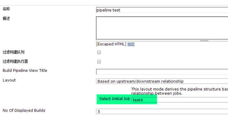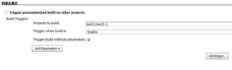 上图中我们的初始job是test4,可以先对它进行设置。进入该job的配置页面,然后选择【构建后操作】,接着选择【Trigger parameterized build on other projects】