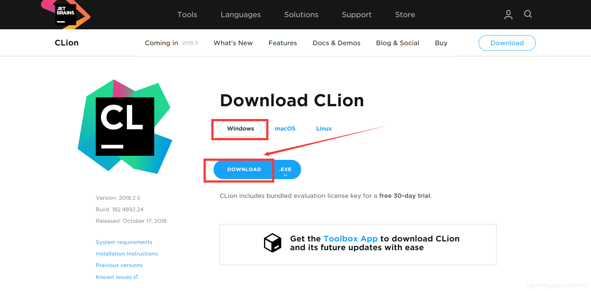 下载地址:http://www.jetbrains.com/clion/download/#section=windows