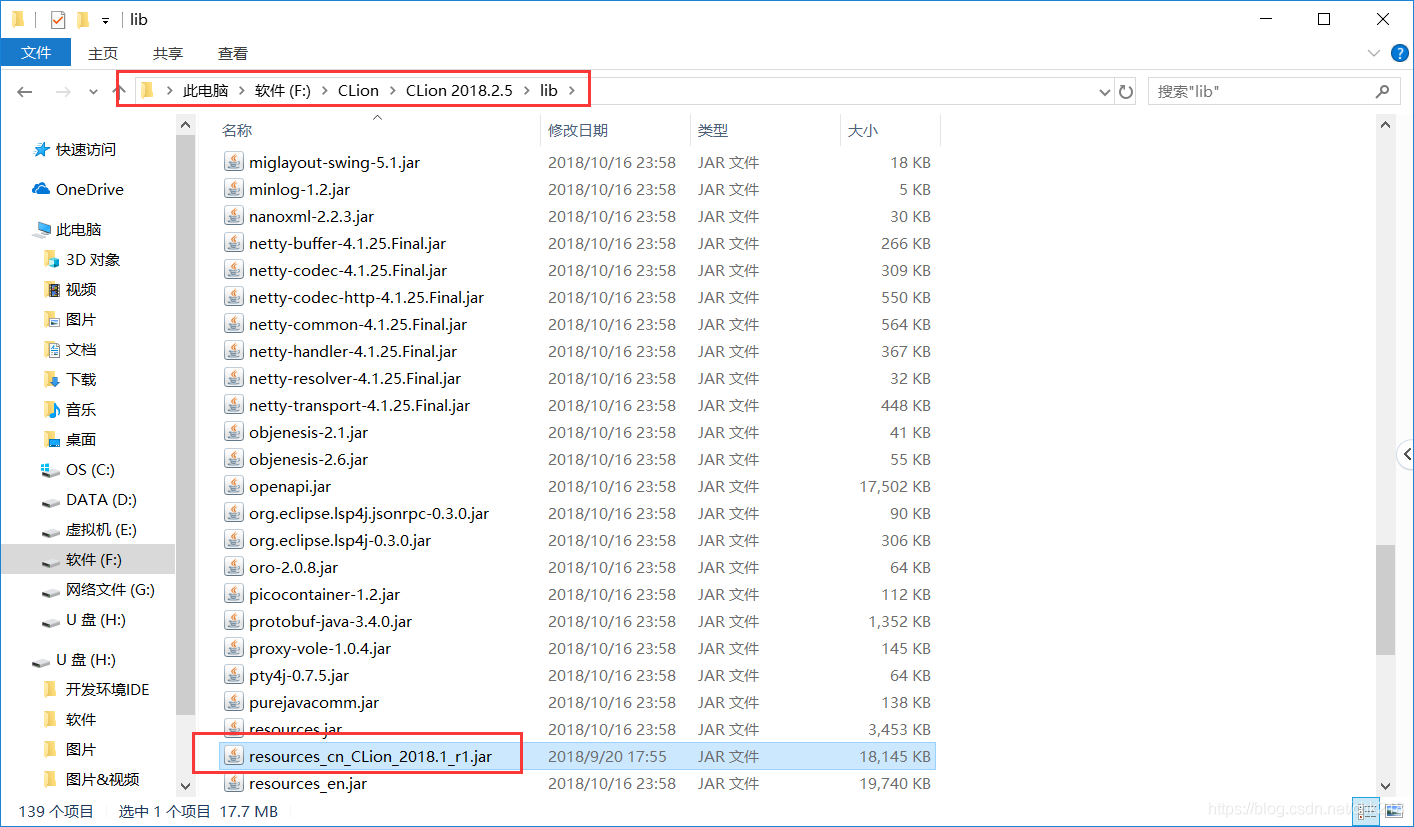 2. 把CLion中文包复制到CLion安装目录下的lib文件夹内(如下图)