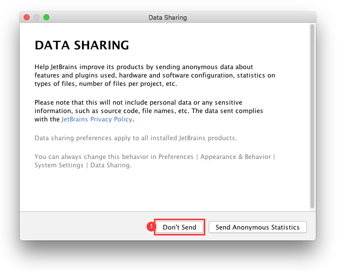 此窗口叫做“数据分享”主要是询问我们是否愿意分享我们的pycharm各项设置信息等,我们选择不发送即可,点击上图标注1处“Dont Sent”按钮进入PyCharm配置窗口如下