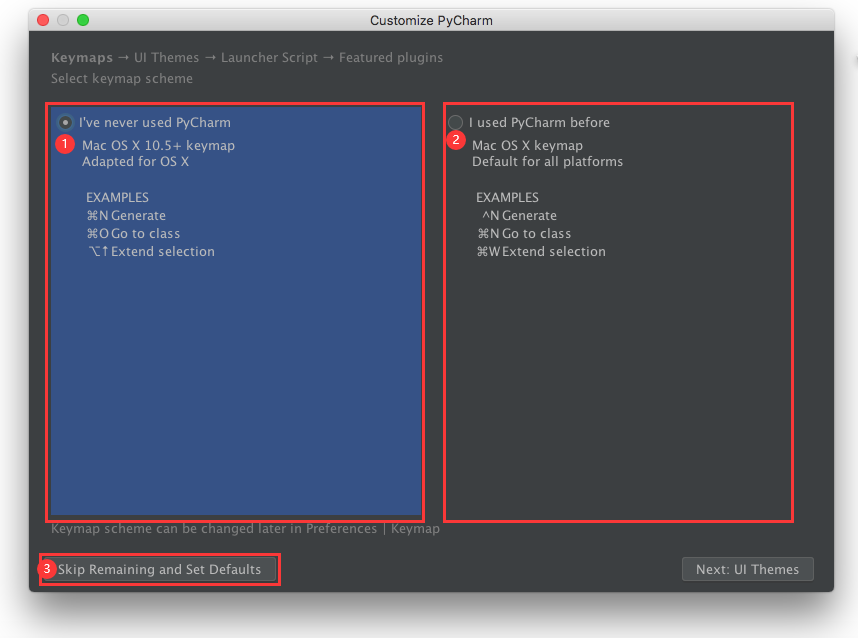 我们使用默认值,所以只需要点击上图标注3处“Skip Remaining and Set Defaults”按钮跳过并使用默认设置进入激活PyCharm窗口下图所示(如果你对其它设置感兴趣的请可以选择上图中的“Next: UI Themes”按钮)