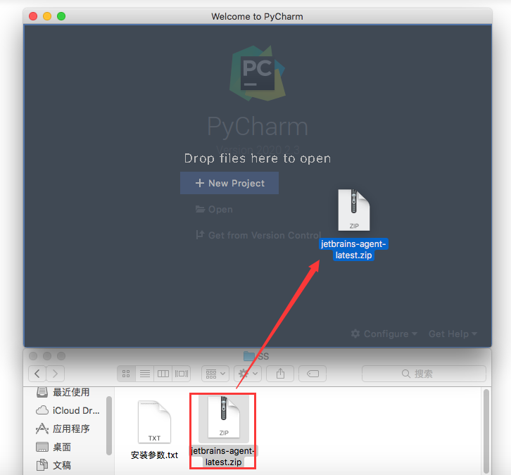 下载上图中的2个文件到本地后打开PyCharm进入PyCharm项目选择窗口,用鼠标拖动jetbrains-agent-latest.zip文件到PyCharm的窗口中(PyCharm的任意窗口都可以)如下图