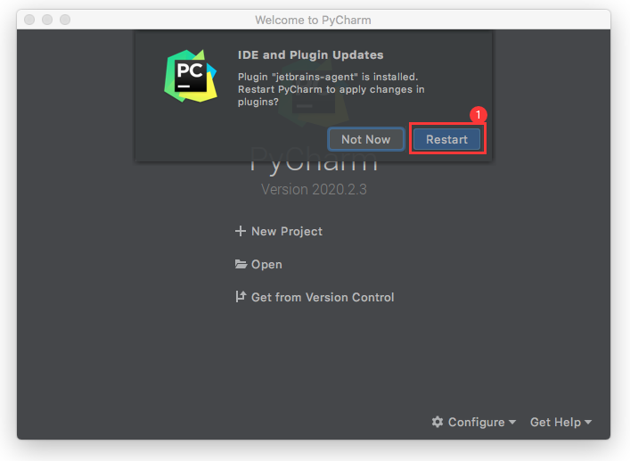 完成拖放操作后PyCharm会弹出jetbrains-agent插件安装完成并需要重启PyCharm的窗口我们选择重启下图标注1处“Restart”按钮重启PyCharm