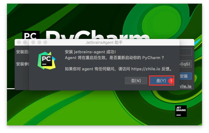 点击上图标注2处“为PyCharm安装”按钮后弹出“安装jetbrains-agent成功”窗口并需要再次重启PyCharm如下图所示,点击下图标注1处“是”重启PyCharm