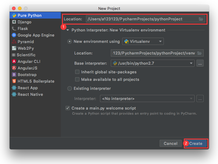重启PyCharm完成后,进入PyCharm项目选择窗口,选择下图标注1处“New Project”新建项目如下图