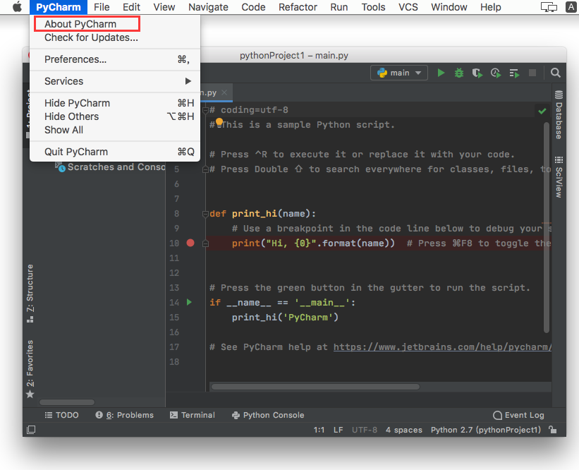 在PyCharm主界面处于当前状态下点击Mac系统菜单栏“PyCharm”中的“About PyCharm”查看PyCharm是否激活成功