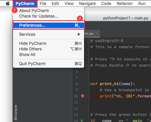 打开PyCharm主界面并处于当前状态,点击Mac菜单栏“PyCharm”中的“Preferences...”菜单如下图