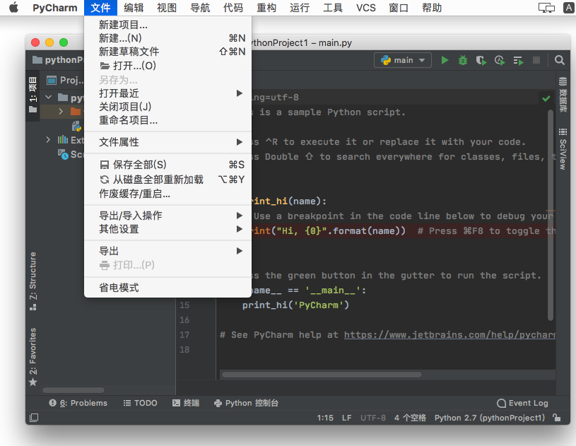 我们点击上图标注1处“Restart”按钮重启PyCharm,PyCharm完成重启后你会看到PyCharm中文界面下图所示
