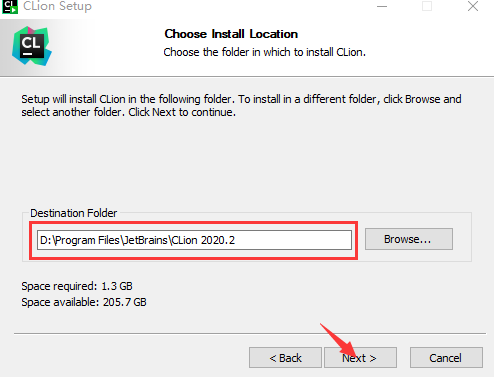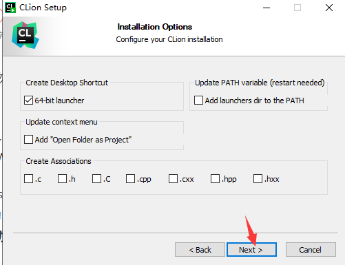 2. 双击打开 Clion2020安装包,设置好安装路径,如有固态硬盘推荐安装到固态硬盘,点击 Next