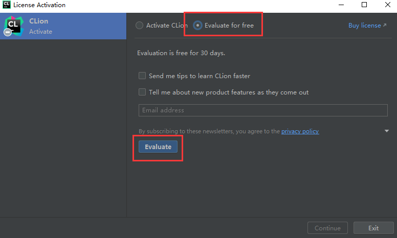 10. 勾选 Evaluate for free , 点击 Evaluate,进行 Clion2020为期30天的试用