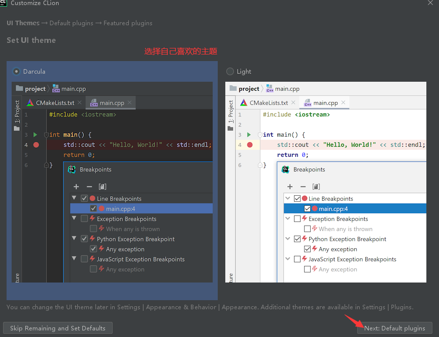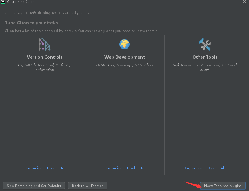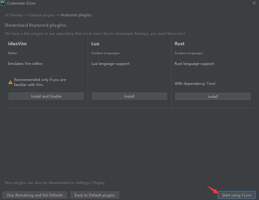 9. 根据自己需要安装插件,点击 Start Using Clion