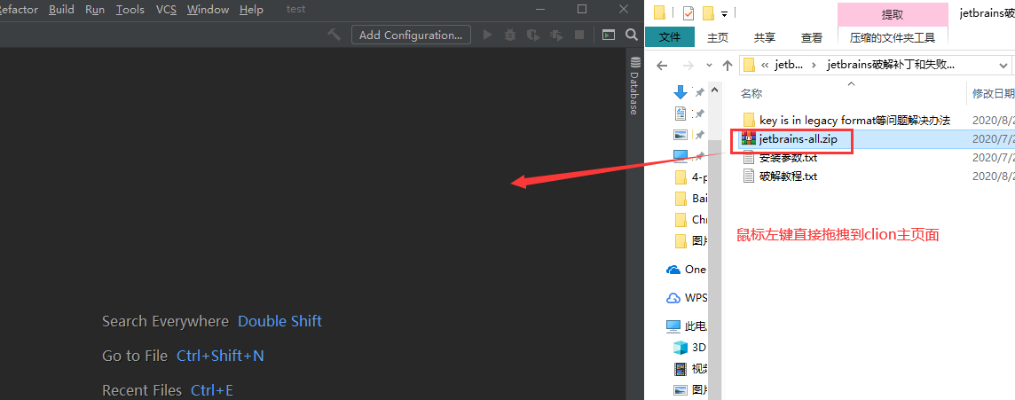 15. 从网盘下载的 Clion2020破解包中,找到 jetbrains-all.zip,用鼠标左键拖拽至 Clion2020软件主页面(注意不用解压!不用解压!不用解压!)