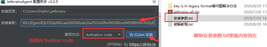 17. 把Clion破解包中的 安装参数.txt 用记事本打开,复制里面的全部内容到,左边 安装参数 中,激活方式选择 Activation code ,点击 为 Clion安装