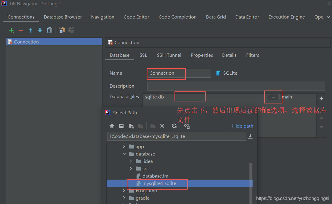 conn = DriverManager.getConnection("jdbc:sqlite:F:\\codeZ\\database\\mysqlite1.sqlite");
