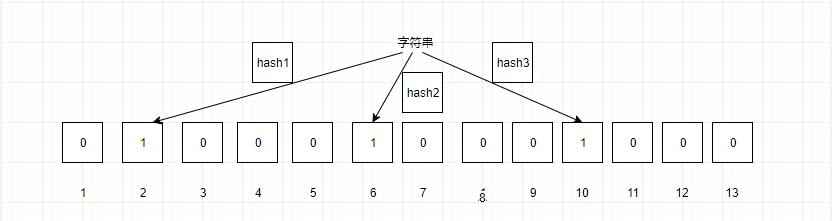 当我们要映射一个值到布隆过滤器时,首先计算三个哈希函数的值,然后对13取余,映射到对应位中,图中映射到2,6,10,这样我们就完成了一个值的映射。