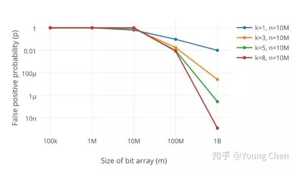 在同样数据规模下,不同大小的bit数组及不同数量k的哈希函数对误判率的结果: