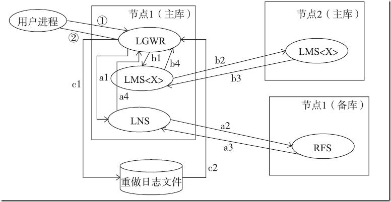 步骤①和②时所经历的时间就是log file sync所经历的时间。a1~a4是LGWR传送重做日志到备库的过程,b1~b4是LGWR传播SCN的过程,c1~c2是LGWR将重做日志写入到重做日志文件的过程。