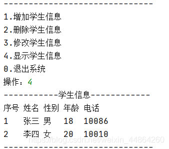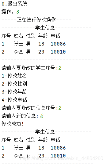print("1-修改姓名\n2-修改性别\n3-修改年龄\n4-修改电话")