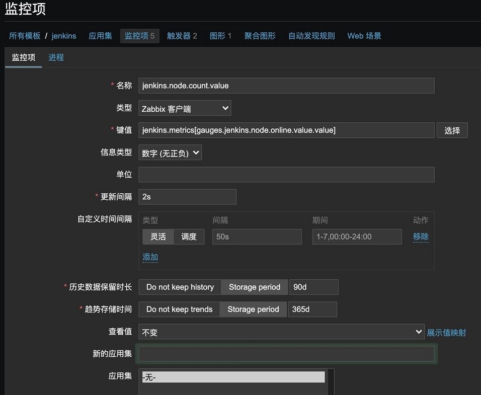 - 键值:由于我们要监控的指标并不是 Zabbix 预定义的。所以,需要使用用户自定义参数来实现监控 Jenkins 指标。Key 填的值为:jenkins.metrics[gauges.jenkins.node.count.value.value]。jenkins.metrics是需要执行的真正的 Key 名称。而 [] 内是传给该 Key 对应的命令的参数。对于初学者,Zabbix 这部分概念非常不好理解。也许这样会更好理解:在使用用户自定义参数来实现监控的情况下,Zabbix server 会将这个 Key 发送给 agent,然后 agent 根据这个 Key 执行指定的 逻辑 以获取指标数据。这个 逻辑 通常是一段脚本(shell命令或Python脚本等)。而脚本也是可以传参的,[]中的值就是传给脚本的参数。