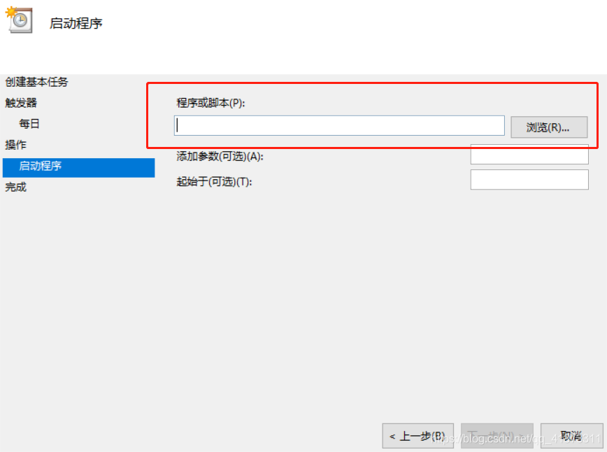 下一步,设定启动程序,“浏览”,添加刚才的Bat脚本即可