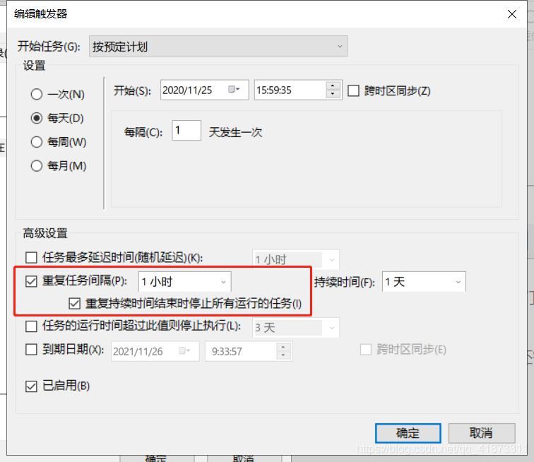 因为要实现每隔一小时重复运行该脚本的目的,所以我们勾选“重复任务间隔”,并设置间隔时间为1小时。