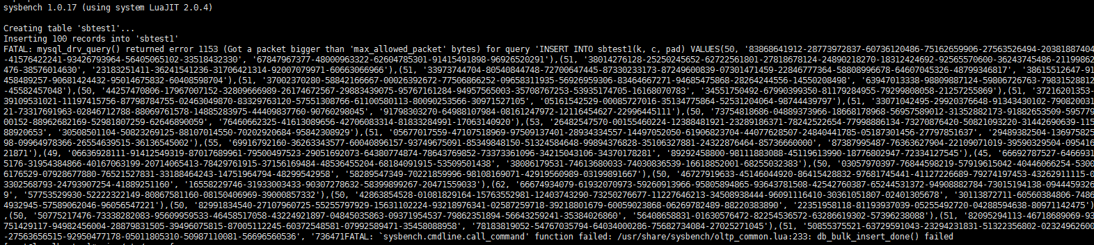 sysbench /usr/share/sysbench/oltp_read_write.lua --tables=5 --table_size=100 --mysql-user=root --mysql-password=xxx --mysql-host=192.168.0.103 --mysql-port=3306 --mysql-db=sysbench_test prepare