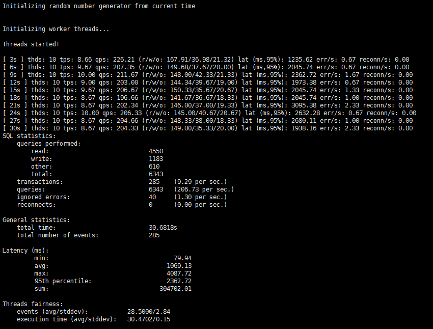 sysbench /usr/share/sysbench/oltp_read_write.lua --mysql-user=root --mysql-password=xxx --mysql-host=192.168.0.103 --mysql-port=3306 --mysql-db=sysbench_test --tables=5 --table_size=100 --threads=10 --time=30 --report-interval=3 run