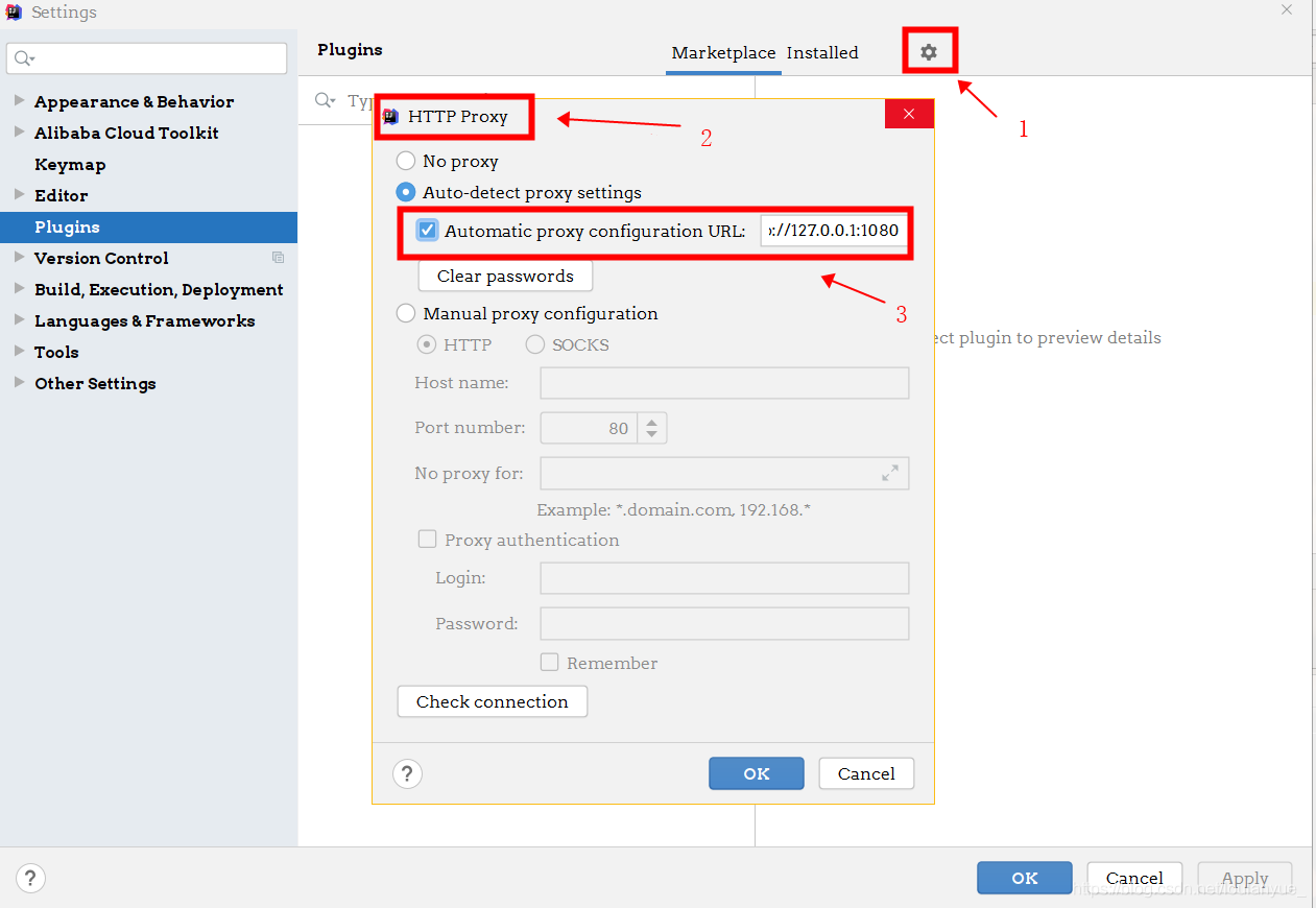 或者 选择File—>Setting—>Appearance&Behavior—>System Settings—>HTTP Proxy进行配置,地址推荐用:https://plugins.jetbrains.com,如果不行也可以配置http://127.0.0.1:1080
