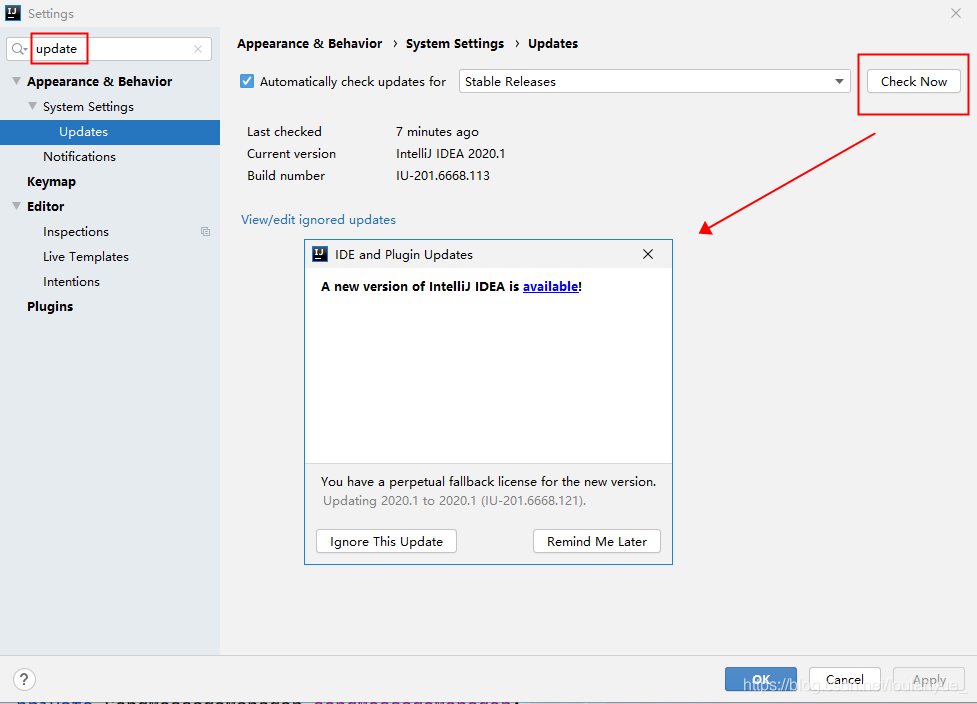 二、步骤一完成后如果还不行,检查Setting—>update—>Check Now是否能正常连接到IDEA 官网