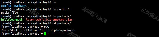 将jar包放入hellolearn.sh的同一个文件夹目录,即/data/docker/hellolearn/scriptdeploy/package,创建容器时再将该目录(宿主机目录)与容器的/data目录进行映射。。