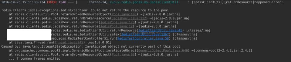 该错误大致意思是说:不能将redis连接放回池内,放回连接池的对象是无效的对象。在网上查了很多同类错误,都说是进行了两次returnResource释放连接资源造成的,因为第一次return成功以后,第二次return就会报上面这个错误。但是显然,我翻遍了代码并没有两次调用returnResource。
