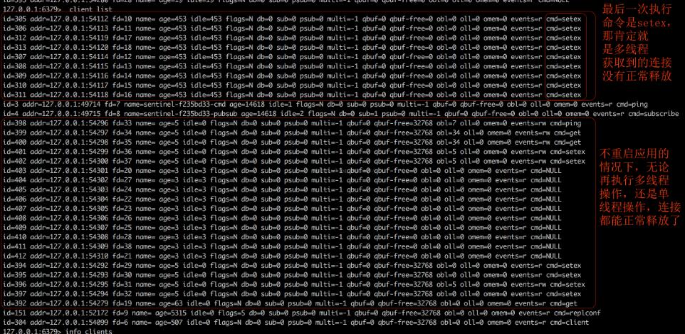 初步怀疑是多线程执行redis操作,初始化redis连接池有问题。于是重启应用,先执行单线程redis操作,再执行多线程redis操作,没有发生上面的问题。redis服务端连接均能正常释放。由此得出结论,当线程池在未初始化的时候,由于多线程同时执行redis连接池初始化工作引起的问题。