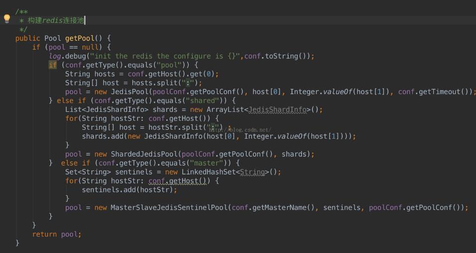 看代码(RedisJedisPool未优化之前):当10个线程同时请求redis连接资源时,10个线程都发现连接池为空(因为创建连接池相比创建线程比较耗时),这时10个线程都各自初始化成功一个连接池,并从中取得redis连接,并执行了redis操作。执行完毕,returnResource的时候,由于此时pool变量的引用是最后一个线程初始化的连接池,前面9个线程获得的redis连接并不属于最后一个连接池的资源,所以抛错:IllegalStateException: Invalidated object not currently part of this pool