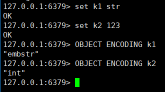 上面的命令我们给string 数据类型 k1 复制str,给 k2 复制123,通过 OBJECT ENCODING 显示底层实现的数据类型分别是 embstr 和 int。