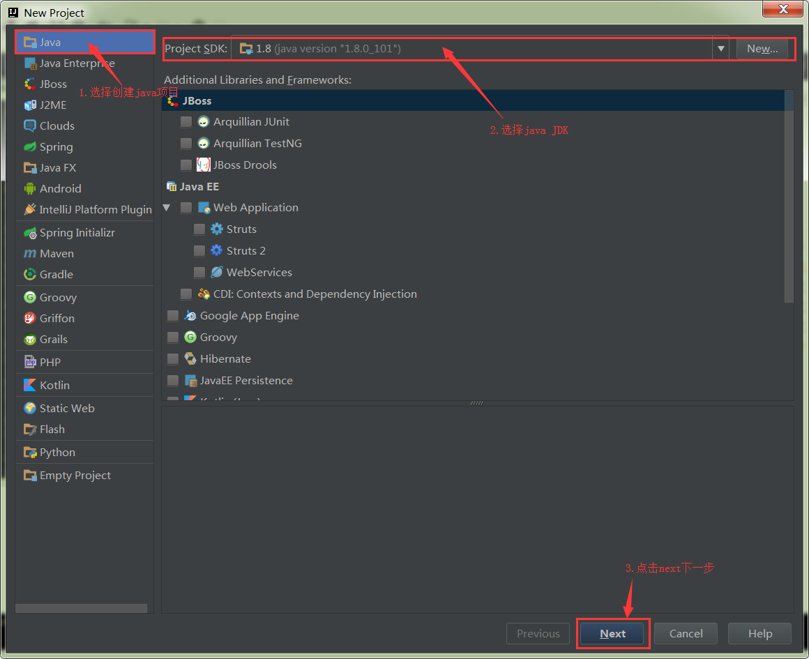 2,第二步选择创建java项目,并选择自己的jdk(我自己本地已经配置了所以有),没有可以点击new去自己的安装目录下找,一般默认安装C:\Program Files\Java,然后选择next 下一步