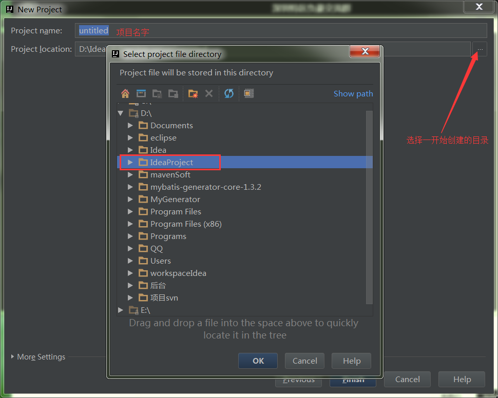 首先在自己的D盘下建一个文件夹,用来存放我们待会新建的项目,我创建了IdeaProject: