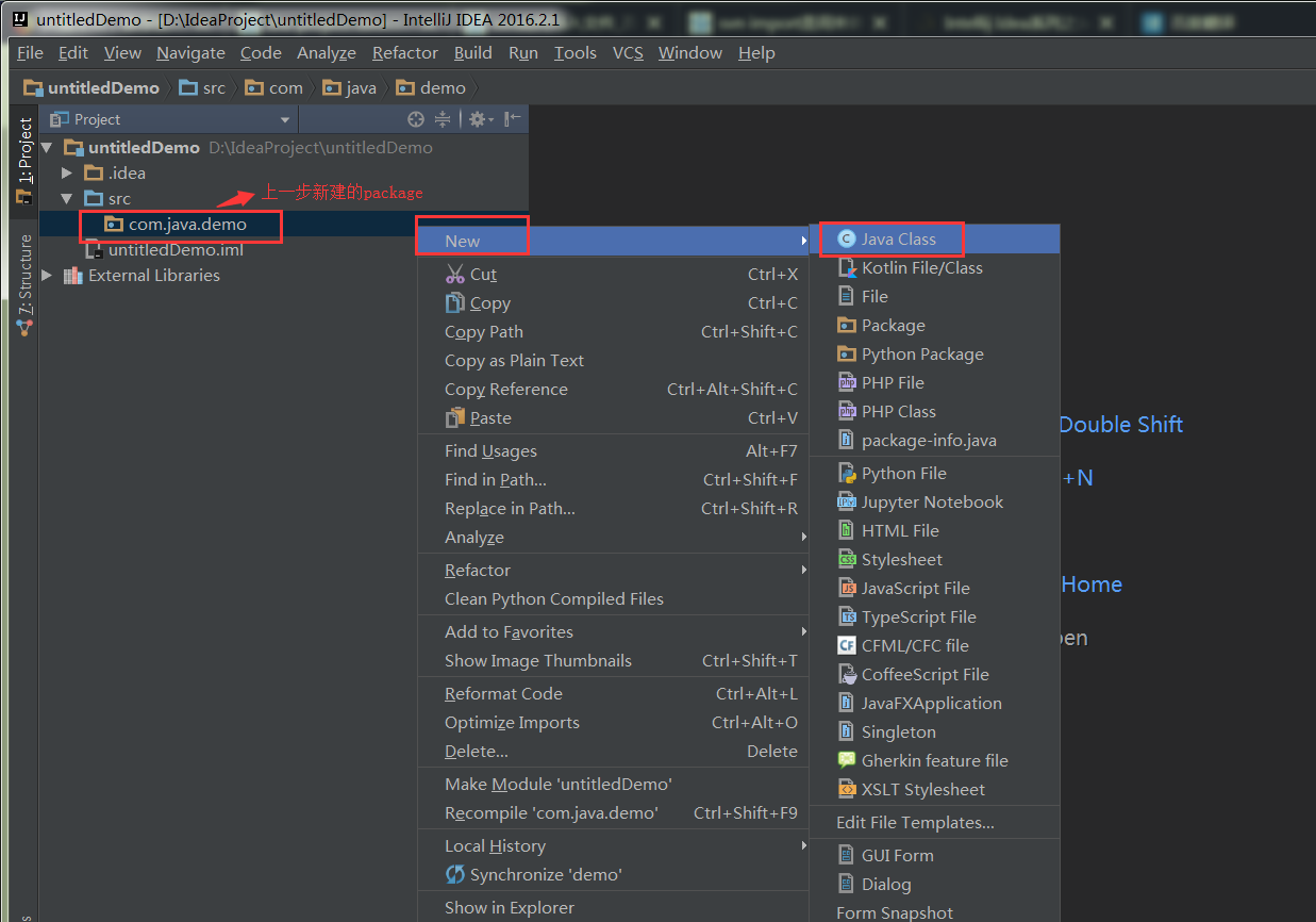 下面我们在新创建的目录下新建一个class,选中com.java.demo右击->new->java class