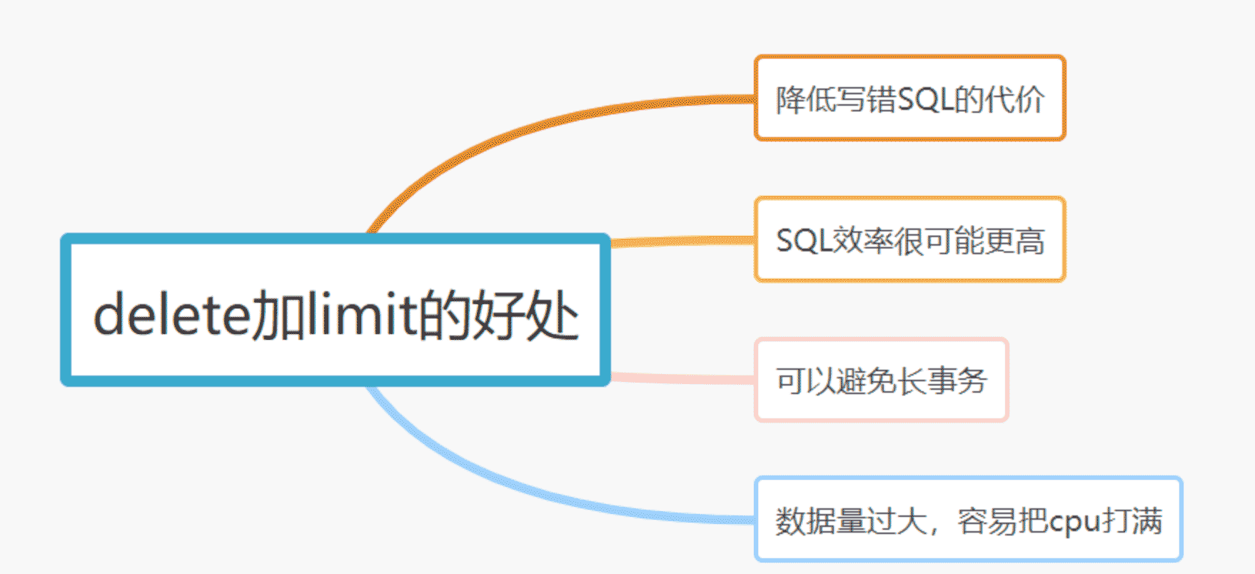 1、降低写错 SQL 的代价,你在命令行执行这个 SQL 的时候,如果不加 limit,执行的时候一个不小心手抖,可能数据全删掉了,如果删错了呢?加了 limit 200,就不一样了。删错也只是丢失 200 条数据,可以通过 binlog 日志快速恢复的。