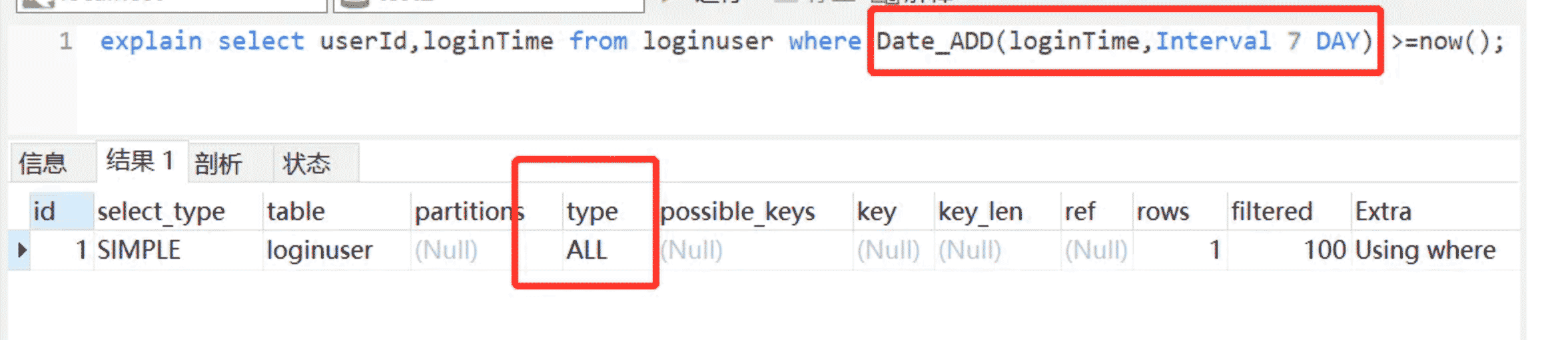 explain select userId,loginTime from loginuser where loginTime >= Date_ADD(NOW(),INTERVAL - 7 DAY);