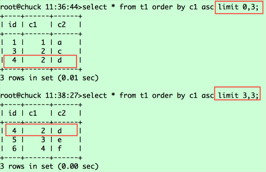 select * from t1 order by c1,id asc limit 0,3; select * from t1 order by c1,id asc limit 3,3;