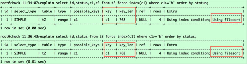 select id,status,c1,c2 from t2 force index(c1) where c1>='b' order by status; select id,status from t2 force index(c1) where c1>='b' order by status;