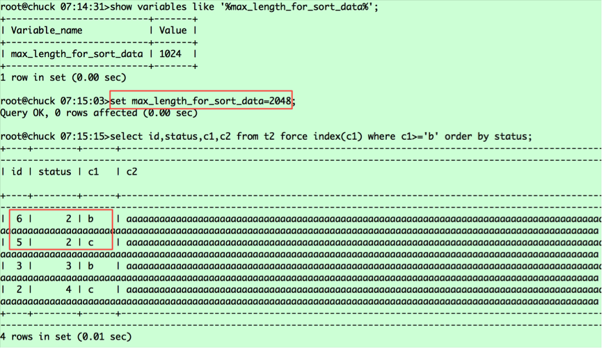 (c1,id)===(b,6),(b,3),(5,c),(c,2),对应的status值分别为2 3 2 4。从表中捞取数据并按status排序,则相对位置变为(6,2,b),(5,2,c),(3,3,c),(2,4,c),这就是第二条语句查询返回的结果,那么为什么第一条查询语句(6,2,b),(5,2,c)是调换顺序的呢?这里要看我之前提到的a.常规排序和b.优化排序中标红的部分,就可以明白原因了。由于第一条查询返回的列的字节数超过了max_length_for_sort_data,导致排序采用的是常规排序,而在这种情况下MYSQL将rowid排序,将随机IO转为顺序IO,所以返回的是5在前,6在后;而第二条查询采用的是优化排序,没有第二次捞取数据的过程,保持了排序后记录的相对位置。对于第一条语句,若想采用优化排序,我们将max_length_for_sort_data设置调大即可,比如2048。