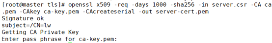 [root@master tls]# openssl x509 -req -days 1000 -sha256 -in server.csr -CA ca.pem -CAkey ca-key.pem -CAcreateserial -out server-cert.pem Signature ok subject=/CN=lw Getting CA Private Key Enter pass phrase for ca-key.pem: