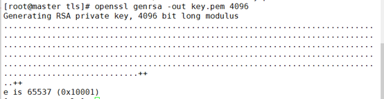 [root@master tls]# openssl genrsa -out server-key.pem 4096 Generating RSA private key, 4096 bit long modulus ...............................++ ................................++ e is 65537 (0x10001)