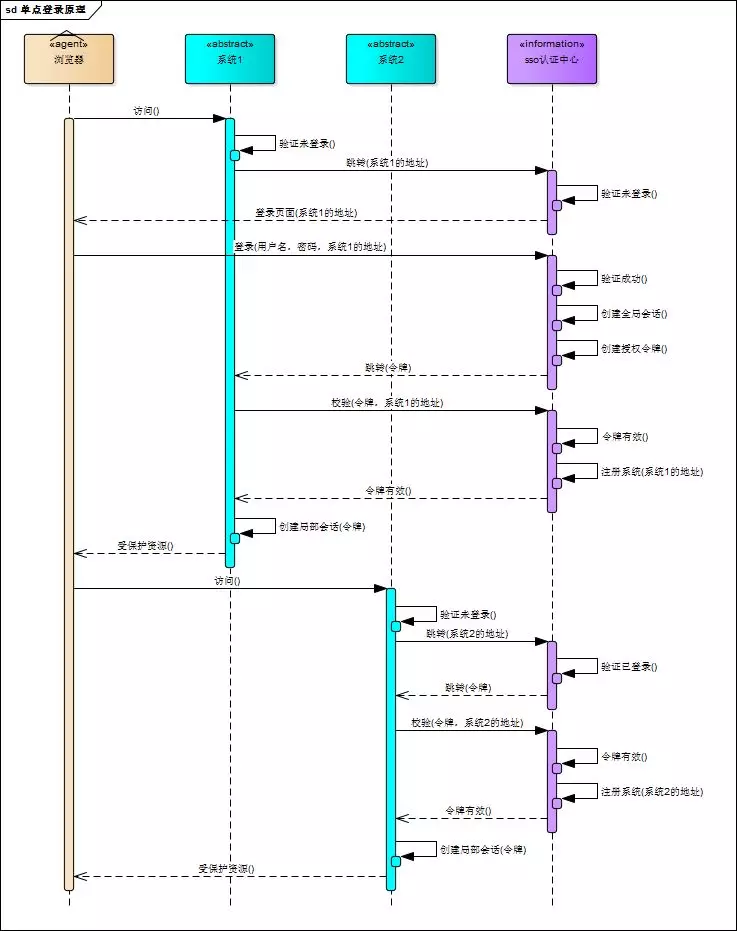相比于单系统登录,sso需要一个独立的认证中心,只有认证中心能接受用户的用户名密码等安全信息,其他系统不提供登录入口,只接受认证中心的间接授权。间接授权通过令牌实现,sso认证中心验证用户的用户名密码没问题,创建授权令牌,在接下来的跳转过程中,授权令牌作为参数发送给各个子系统,子系统拿到令牌,即得到了授权,可以借此创建局部会话,局部会话登录方式与单系统的登录方式相同。这个过程,也就是单点登录的原理,用下图说明