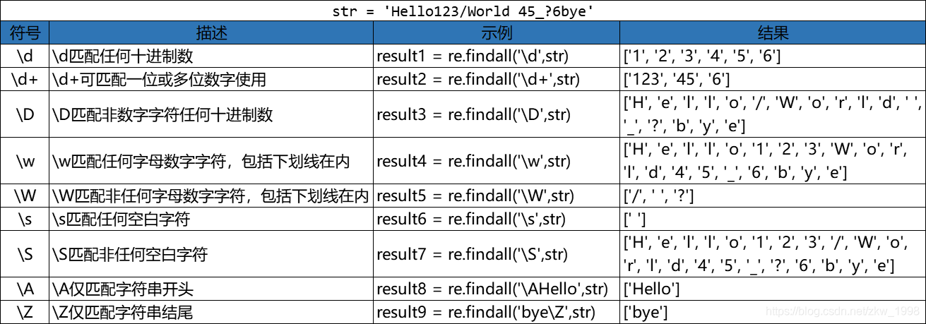 result4 = re.findall('\w',str)#\w匹配任何字母数字字符,包括下划线在内