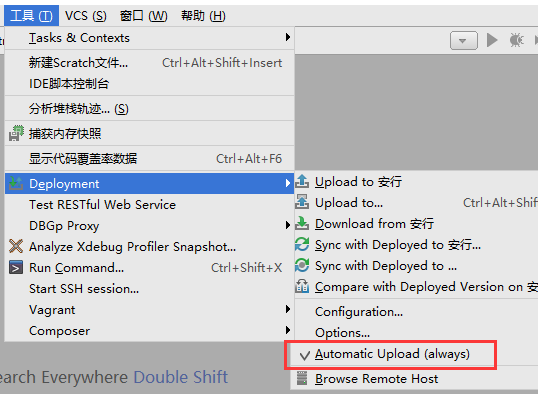 菜单栏找到【工具/Tools】->【Deployment/部署】->【Automatic Upload/自动上传】。
